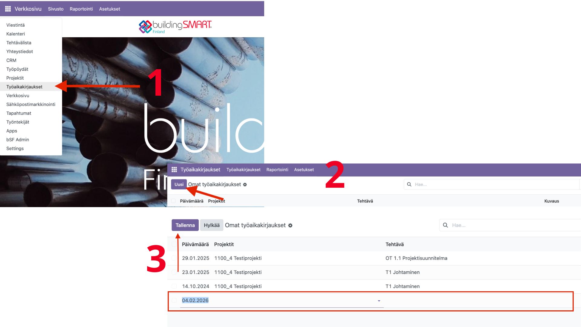 Polku Tuntikortteihin: ERP valikko / Työaikakirjaukset / Uusi